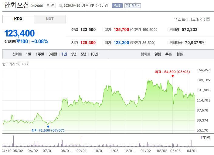 한화오션 주가 52주 변화